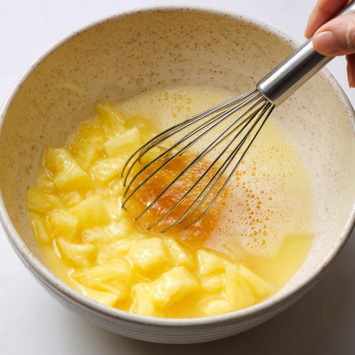 Whisk eggs until blended. Slowly pour in oil while whisking. Add vanilla and drained pineapple.